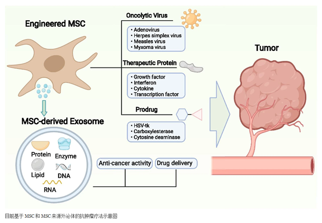 MSCs 可以进行基因修饰以表达或分泌多种抑制癌症细胞生长和阻止癌症进展的药物。这些药物可分为三大类:治疗性蛋白、自杀基因、溶瘤病毒。