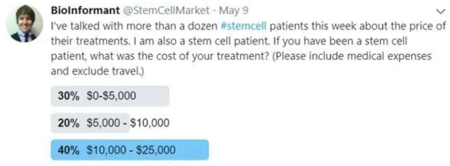 Twitter的民意调查结果也显示,干细胞治疗的平均花费大致在5,000美元至25,000美元或更多。通常情况下,治疗骨科疾病的费用相对较低,而治疗慢性和复杂疾病的费用则相对较高。