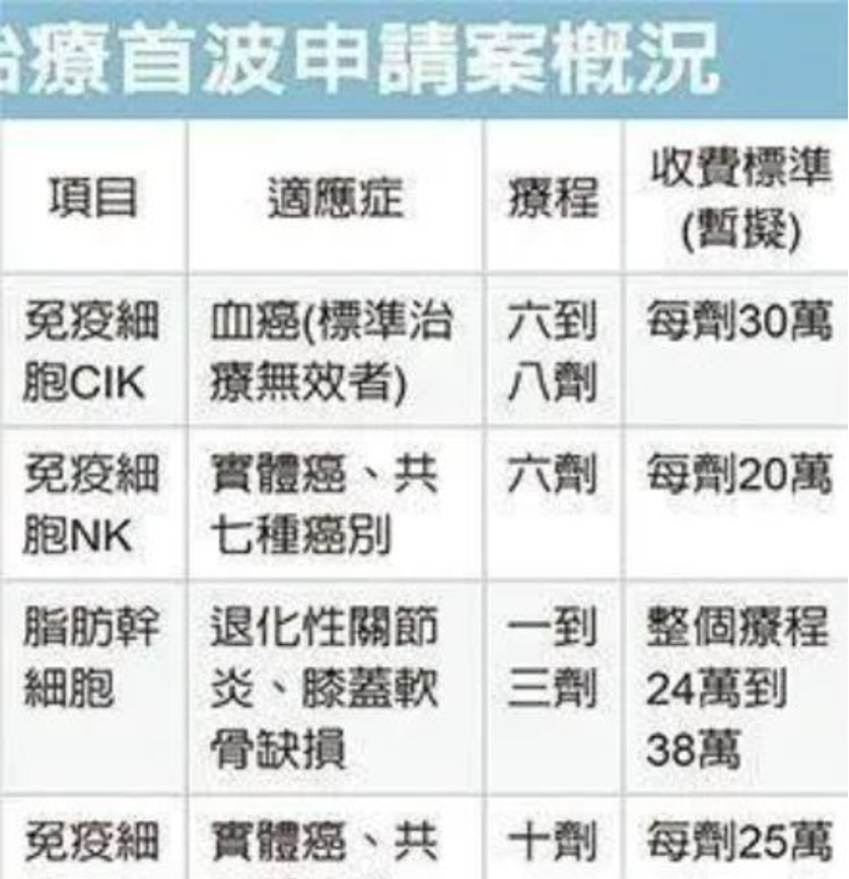 2019年5月3日,中国台湾卫生主管部门批准了首家医院进行自体免疫细胞治疗。首个获批临床应用的细胞类型为自体免疫细胞(CIK),适应症为血液恶性肿瘤经标准治疗无效的患者。根据台湾媒体报道,首批申请的细胞治疗项目相关收费标准如下,其中计价单位为台币,1新台币约合0.27元人民币。具体来说,10万新台币相当于21780元人民币。
