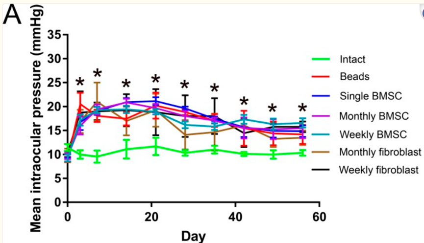 最近的一项研究[4]利用间充质干细胞对青光眼模型大鼠进行治疗。研究人员将大鼠分成三组,第一组作为健康对照组(n = 5),第二组(n = 30)和第三组(n = 35)为青光眼大鼠模型组,分别通过使用前房内微珠或小梁网的激光凝固术,诱导大鼠眼内压升高。