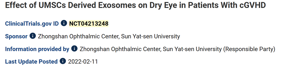 2019年12月注册了一项评估脐带间充质干细胞(UMSC)外泌体缓解干眼症状疗效的临床试验(NCT04213248)。该试验的目的是分析疾病指标的反应,例如眼泪量和对组织的损伤程度,以滴眼剂形式应用外泌体治疗。