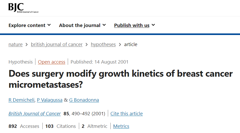 [2]R Demicheli, P Valagussa & G Bonadonna ,et,al.Does surgery modify growth kinetics of breast cancer micrometastases?https://www.nature.com/articles/6691969