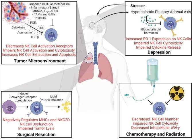 有研究显示,癌症患者患抑郁症的几率高出五倍,抑郁症也会影响NK细胞功能,压力源可以通过下丘脑-垂体-肾上腺轴激活糖皮质激素的产生,从而诱导NK细胞上的PD-1表达并削弱NK细胞的细胞毒性和细胞因子的释放。