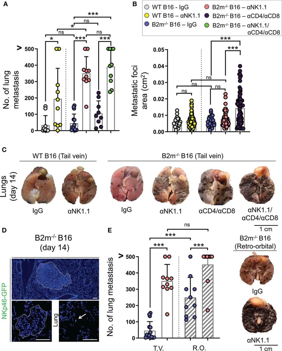 该项研究指出,NK细胞在控制肿瘤转移中起着至关重要的作用,证明了NK细胞和T细胞这监测黑色素瘤转移中的协同作用。研究发现NK细胞有效地限制了B16黑色素瘤细胞的肺部转移,尽管终点肺中的转移灶很大程度上缺乏NK细胞,但它们在促进T细胞募集到转移灶中也起着重要作用。