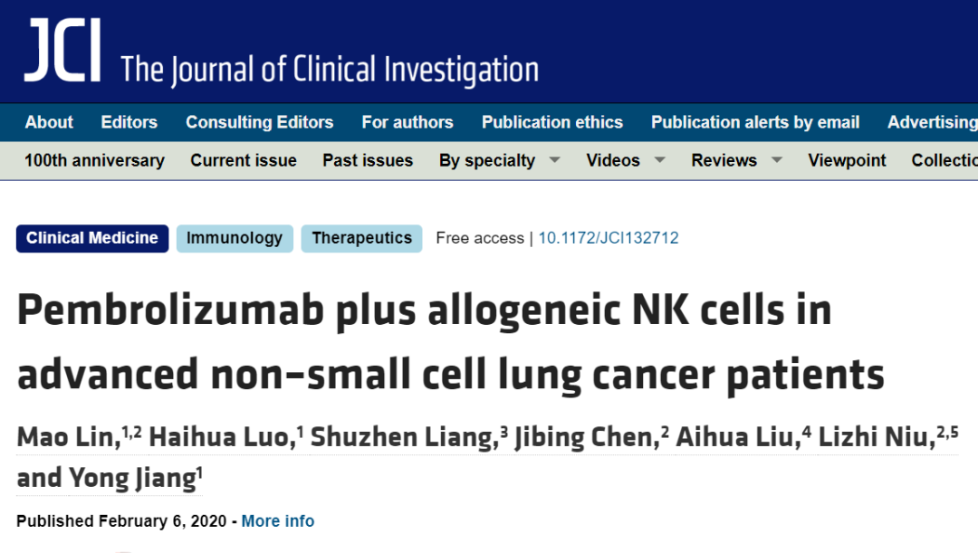 [4]Mao Lin,Haihua Luo,et,al.Pembrolizumab plus allogeneic NK cells in advanced non–small cell lung cancer patients.https://www.jci.org/articles/view/132712