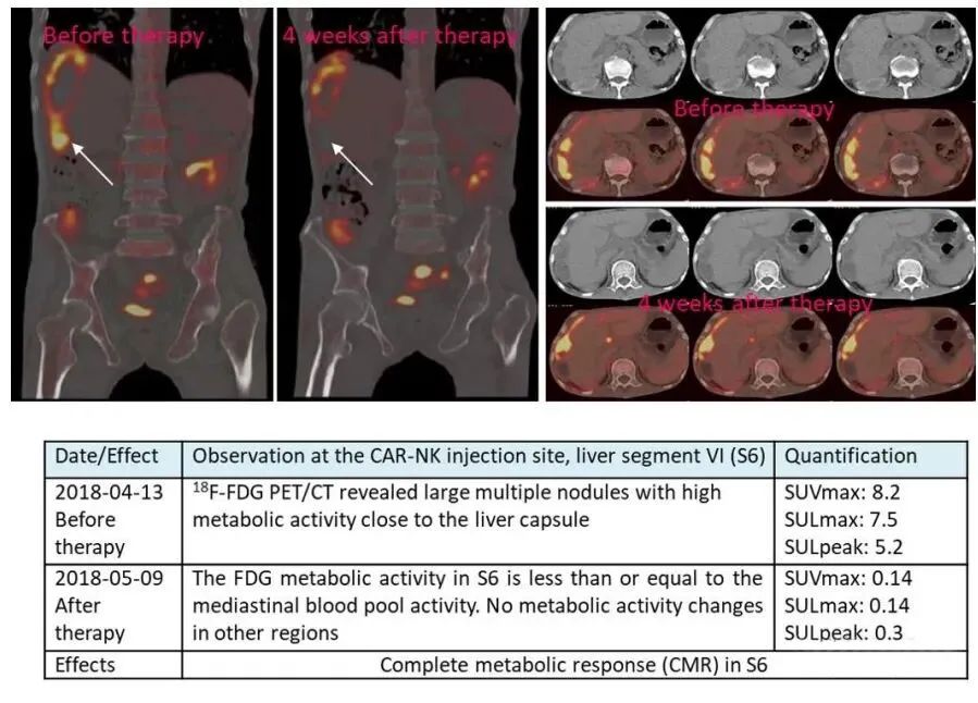 △ CAR-NK 细胞治疗后肝转移病灶 PEC-CT 结果对比图(患者肝Ⅵ段的最大氟脱氧葡萄糖(FDG)摄取值从 8.2 降至 0.14,经评估为完全代谢缓解)
