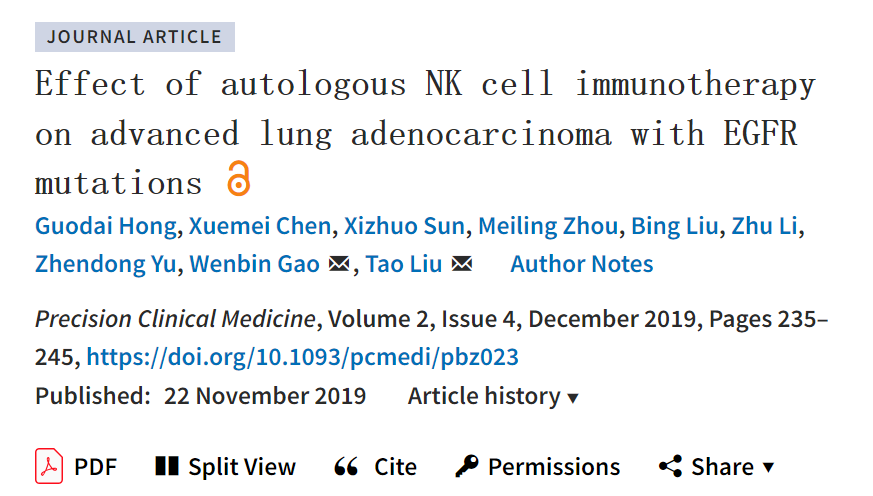 [5]Guodai Hong, Xuemei Chen, et,al.Effect of autologous NK cell immunotherapy on advanced lung adenocarcinoma with EGFR mutations.https://academic.oup.com/pcm/article/2/4/235/5637215?login=false